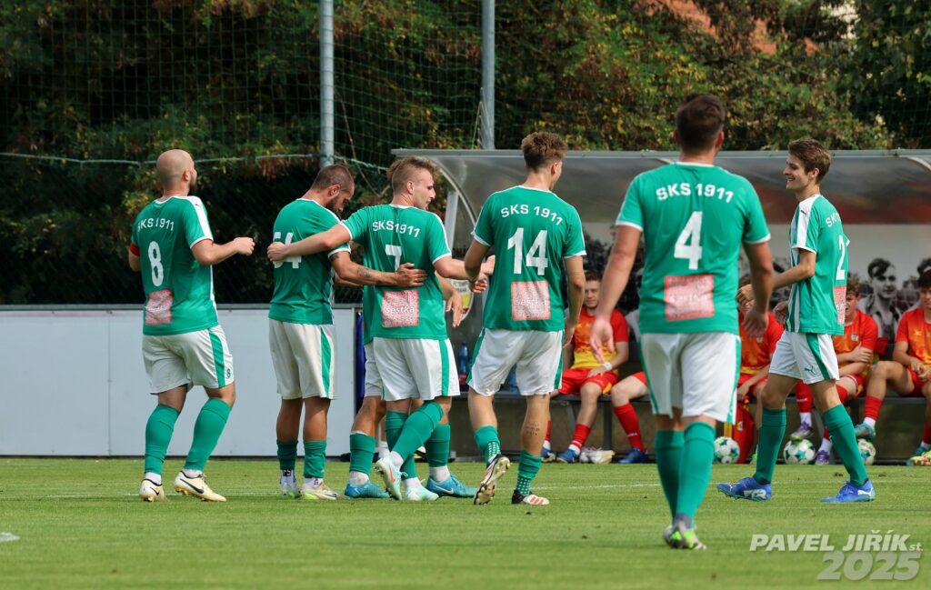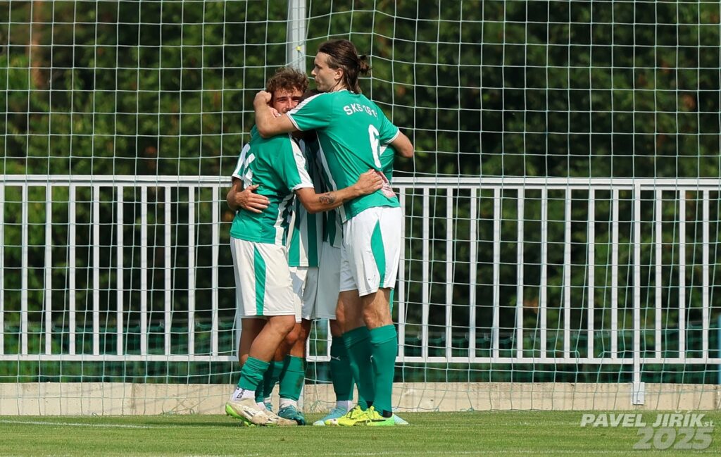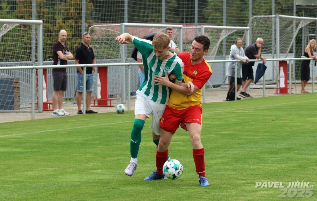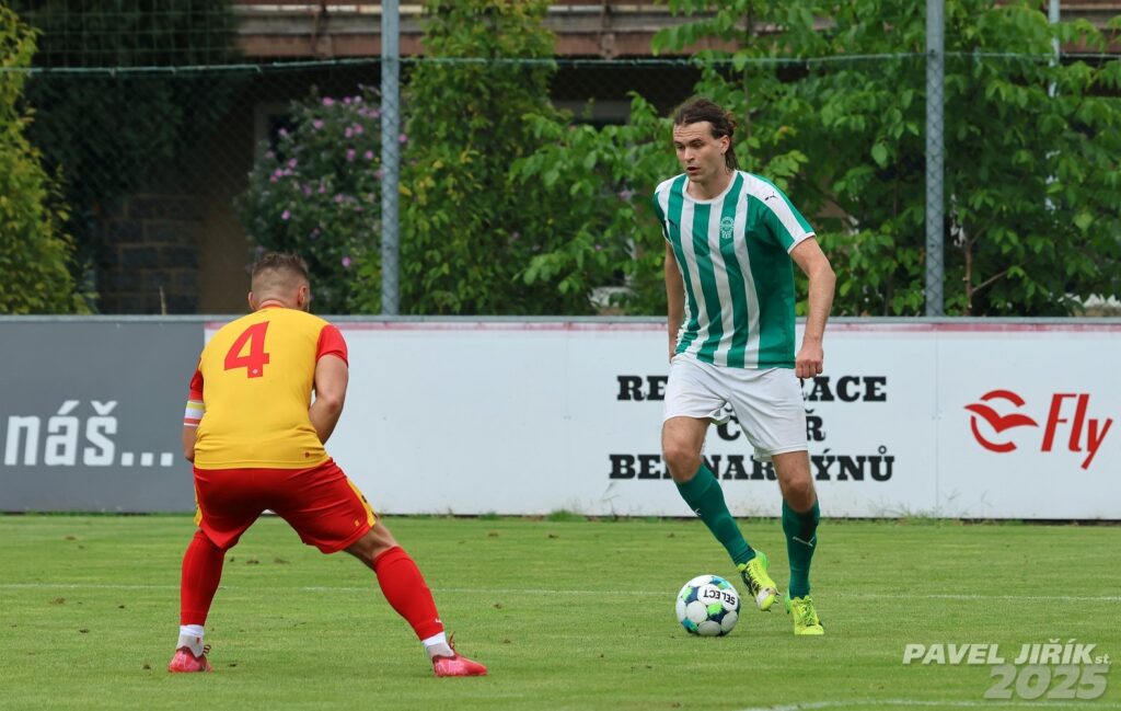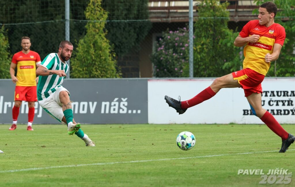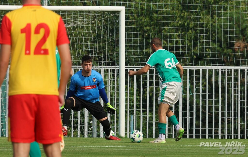 30. minuta. Domácí drželi vysoké tempo hry, byli často na míči, jenže dlouhé a nízké pasy netrefovali optimálně. K první střele a prvnímu ohrožení se dostali až po půlhodině hry. Z rohového kopu hlavičkoval z dobré pozice nejvyšší hráč na hřišti Štěpánek. Hlavičku však poslal přímo doprostřed branky.